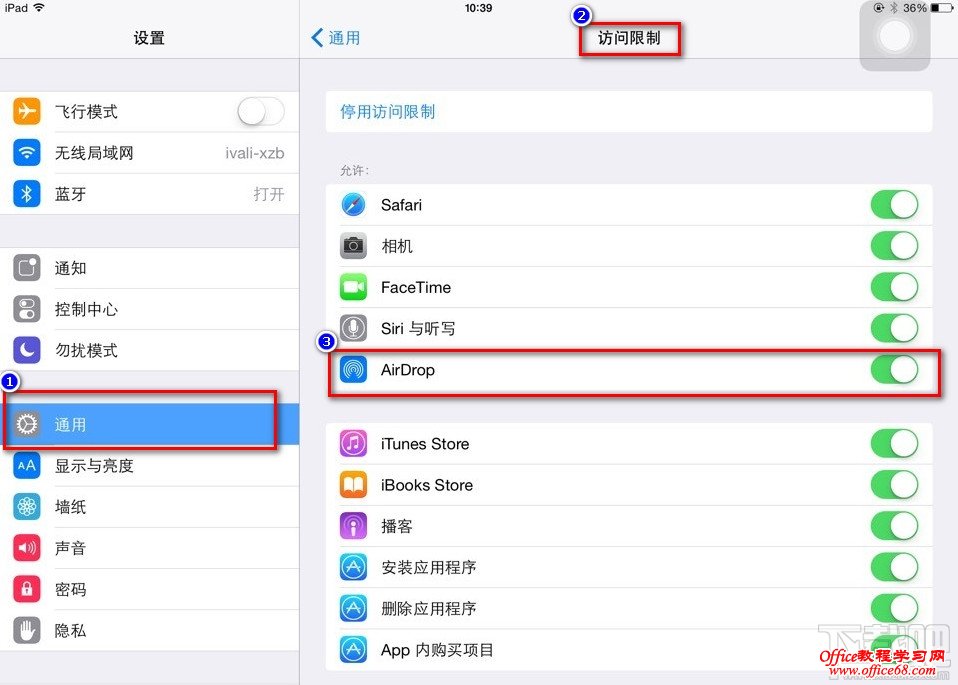 方法二:设置-通用-访问限制-关闭airdrop。绿色就是启动的意思。白色就是关闭的意思。