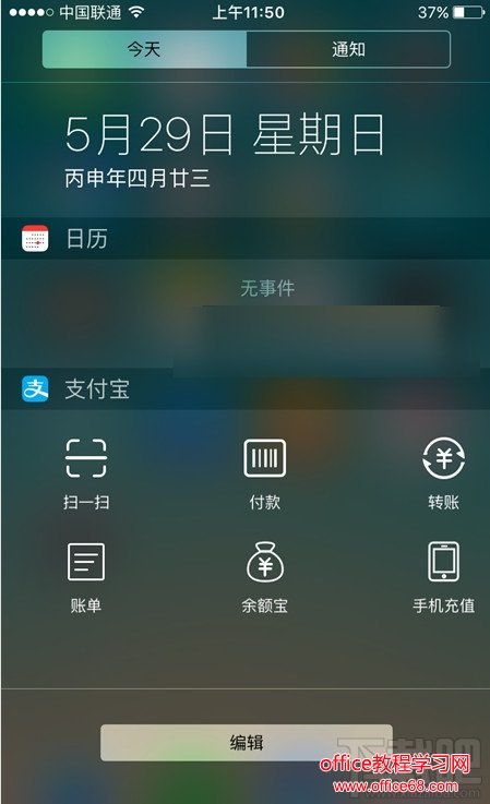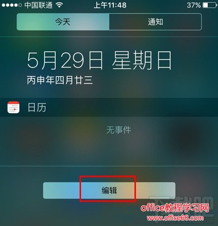一、首先解锁iphone之后下拉屏幕,我们会调出通知栏页面,在其下方点击一下【编辑】