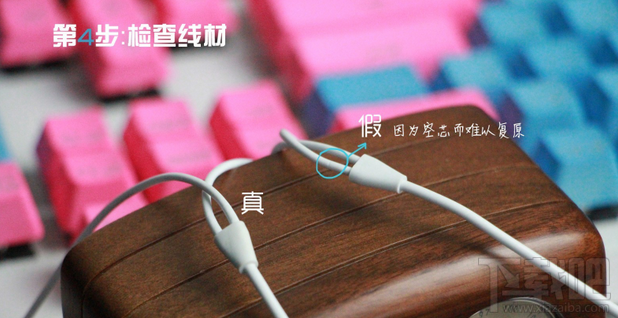 真:Apple早在多年前就采用了一体成型工艺,加上精良的做工,整个耳机表面是接合得十分细致没有太明显的缝隙的。而传音口的金属网下藏着两个小喇叭。 假:缝隙十分明显,像是两个部分拼装而成。但这个假货属于高仿,不拆解内部的话表面和正品基本一样。 (辨认指数一颗星) 【第四步——检查线材】 线材有两处可以辨认真伪,第一处要求眼神很好,第二处要求指甲够狠。 一: