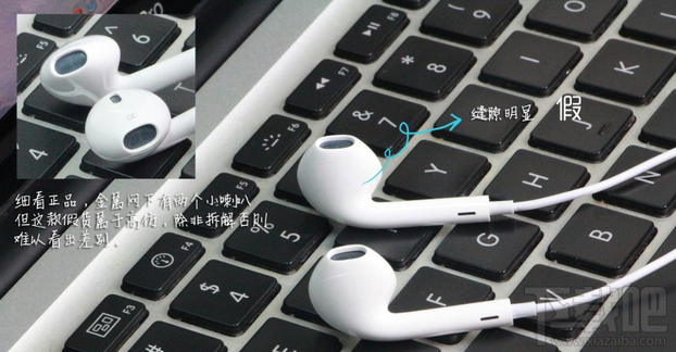 作为键盘界的小天后→_→噗……对于按键自然比较敏感。 真:正品的EarPods只要不在耳边按键,基本上听不到按键声音,因为EarPods的按键采用了静音设计。按键键程短,虽无声却有段落感,手气手落,感觉舒适而精密。 假:假的耳机在按键过程中“嘣嘎”声很大,半米外都能听到声音,不过是夜深人静的情景下。手感则粗糙膈应,键程长,力度要求大。 (辨认指数三颗星) 【第三步——细看耳机单元】