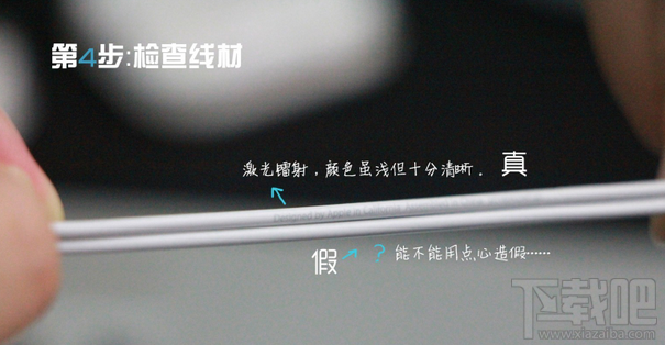 真:原装EarPods在接口处20cm的地方用激光打印了一排浅浅的序列号。它绝对擦不掉,虽然打印内容根据出厂地不同有内容差别,但格式是固定的。比如“Designed by Apple in California Assembled in China DTV……”每一小段话的中间是隔开两个空格键。 假:这条耳机懒得字都没印!但是其他高仿的耳机会仿造,可以用擦去法或检查内容格式法来辨认真假。 二: