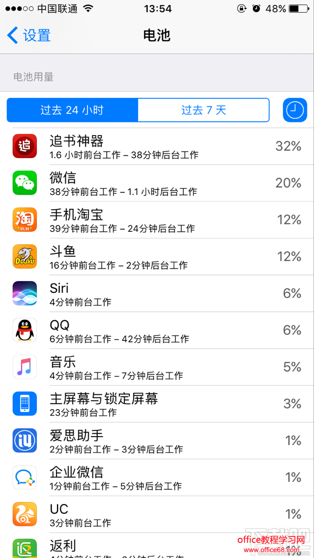 2.打开后我们再下拉即可查看电量的具体使用情况了,点击右边的时钟还可以知道应用最近工作时间哦。