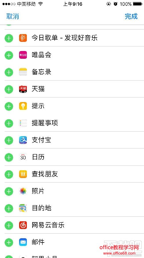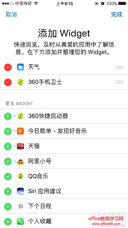 2)这时就会打开可用widget应用列表,选择添加就可以了,这里一支付宝为例,只需点击【支付宝】左边的【+】号,然后点击右上角的【完成】按钮,这样就添加完成了,就可以在widget页面看到支付宝的widget。(如图) |