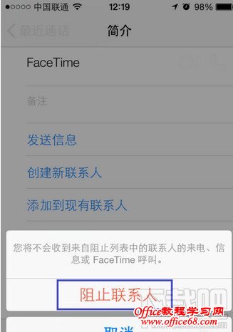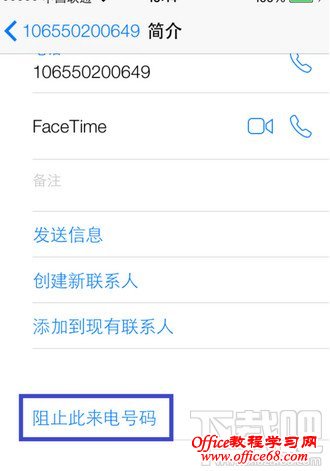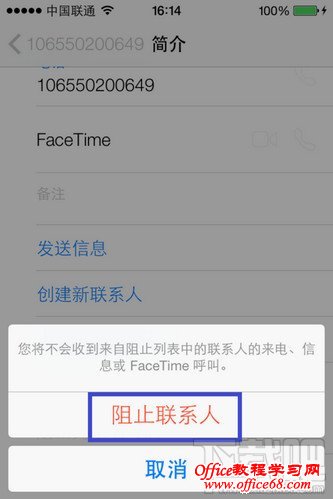然后系统会提示我们将会阻止此号码的电话,信息和FaceTime,点击“阻止联系人”确认阻止。加入以后对方再拨打时就打不进来了,如图所示