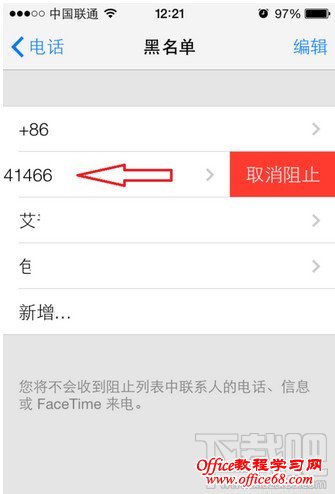 然后就可以看到手机上黑名单中所有被阻止的联系人了,若要取消阻止联系人,可以用手指在联系人一栏向左扫动,即可打开隐藏功能。然后点击“取消止”即可,