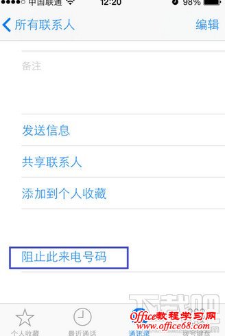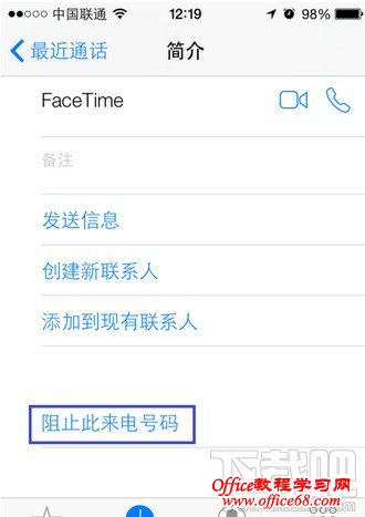 方法三:还可以在通讯录中的联系人添加到黑名单 打开通讯以后,点击要加入黑名单的联系人,在联系人详细信息列表中,点击位于最底部的“阻止此来电号码”选项,然后在弹出的确认阻止选项中,点击“阻止联系人”,
