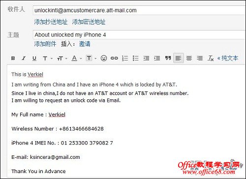 邮件格式: 主题:I want unlock my iPhone4S(我想解锁我的iPhone4S-注意扰iPhone4S换成你自己的设备名字) 邮件内容: HI~ I am writing from China and I have an iPhone which is locked by AT&T. (大意是我有一个有锁的iPhone,我没有AT&T的电话号码,我想得到解锁,复制即可,加上下面的你的个人信息) my name: 用英文写上你的名字(拼音也可以) Wireless Number: +86 (中国手机号) iPhone IMEI NO. 输入你设备的IMEI号码(查询设备IMEI方式) my E-mail: 自己的电子邮件地址(请不要用QQ邮箱,会被拒收,最好用Gmail、Hotmail这类国外邮箱) ========邮件内容结束======== 邮件发出后,会收到AT&T客服系统自动回复的一封邮件,这只是AT&T确认收到你的电子邮件了,一般来说电子邮件处理的速度会慢,大约一周左右,你才会收到是否受理的电子邮件,再过一周甚至更长时间,你才能到解锁。所以是否使用这种方式,决定权在你:) |