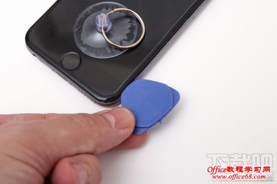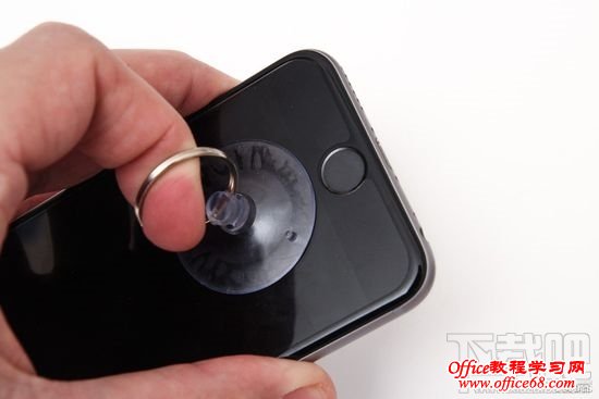 第4步:使用吸盘在主页键(Home)上方拉出屏幕。把吸盘固定在主页键的正上方,另一只手握住机身,然后往外拉。你只需要在屏幕和机身之间撬开足以塞进一个塑料片的空间。