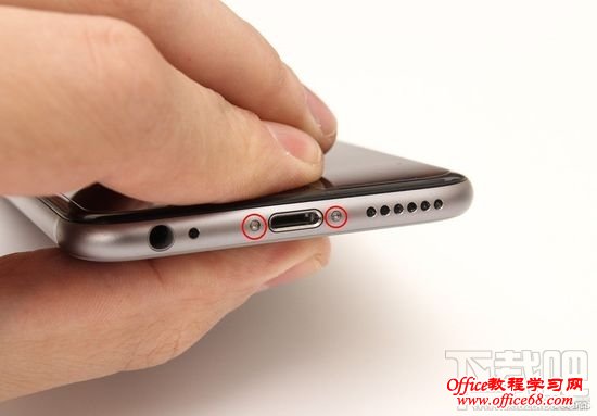 第2步:找到手机充电接口两侧的两颗五角形螺丝。打开iPhone 6你只需要拧开这两颗螺丝。