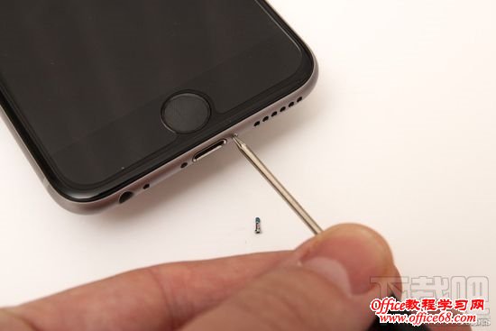 第3步:关掉手机电源,使用工具包里的五角形螺丝刀拧下螺丝。螺丝刀的头部很小,但它跟 iPhone 6底部的小螺丝是匹配的。