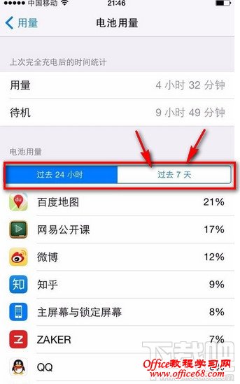 进入电池用量页面后,可以看到 上次完全充电后的时间统计,过去24小时每个应用的用电量百分比,或者选择“过去7天”选项,如下图所示