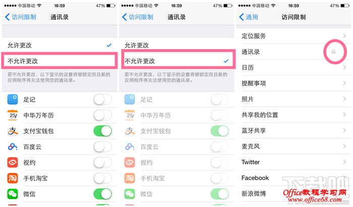 3、将【不允许更改】激活,返回访问限制可见【通讯录】加锁即可。