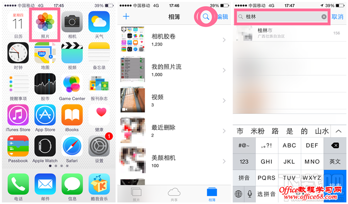 不要到需要了解和用到的时候才来了解,苹果手机iPhone快速搜索照片方法。在平时使用苹果手机的用户,找照片的时候一定感受到一大堆照片不是那里找那里看,虽然有时间但是你就想找那次旅行在其他地方的照片,但就是找不到!下面就一起来看下iPhone照片怎么快速查找吧! 相关教程:iPhone苹果手机iCloud照片流怎么删除; 进入正题,“iPhone苹果手机快速搜索照片方法”教程: 1. 进入iPhone【照片】界面,点击【搜索】,输入【地点】或【日期】可搜索照片。(如图流程)