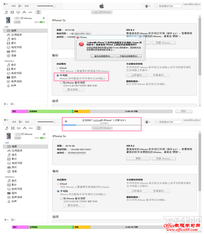 3. 点击【立即备份】,弹出iTunes窗口有两个选择【备份应用程序】和【不备份应用程序】,这里就根据个人需求选择,等待iTunes备份完成。(如图)