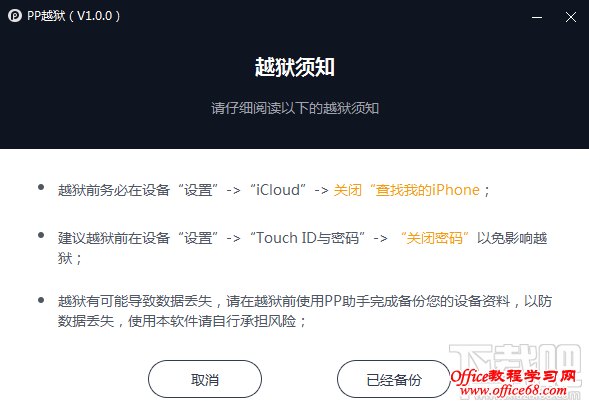 3. 请仔细阅读【越狱须知】后,点击【已经备份】