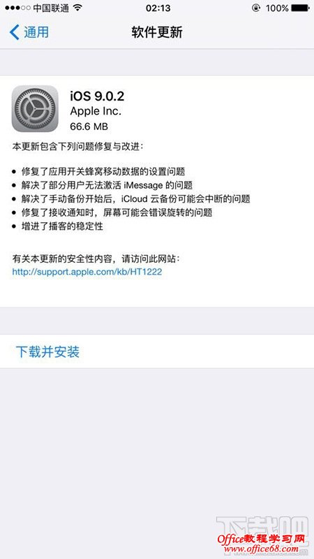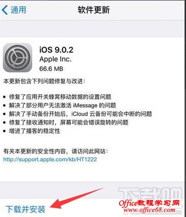 这时系统将自动进入软件更新的搜索,搜索完毕之后,将可以看到本次iOS 9.0.2的更新包大小,其实也并不是太大,60几M的容量大小,我们直接点击下载安装按钮