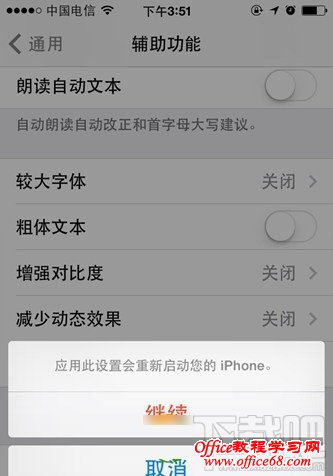 3、手机自动重启 打开选项之后,系统会弹出一个关于重启设备的咨询窗口,点击“继续”即可!