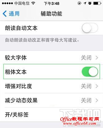 2、勾选“粗体文本” 向下滑动,找到“粗体文字”,将右侧的开关按钮打开。