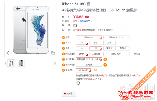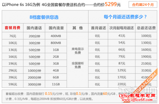 中国联通iPhone 6S合约机两年总花费:5299+76x24-41x23=6180元 (档位76元/月 包含:200分钟通话时长+400MB全国流量+来电显示+3GB省内流量) 中国电信中国电信是最早公布合约套餐的。并且在之前的文章也说过了,中国电信应该是最大几率能提早拿到手机的,因为在预定的时候是直接选择套餐付款的。此外中国电信此次也提供裸机版本的iPhone 6s供用户购买。