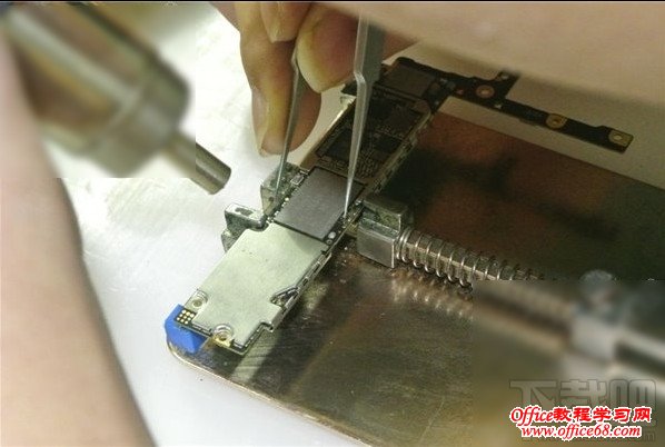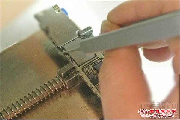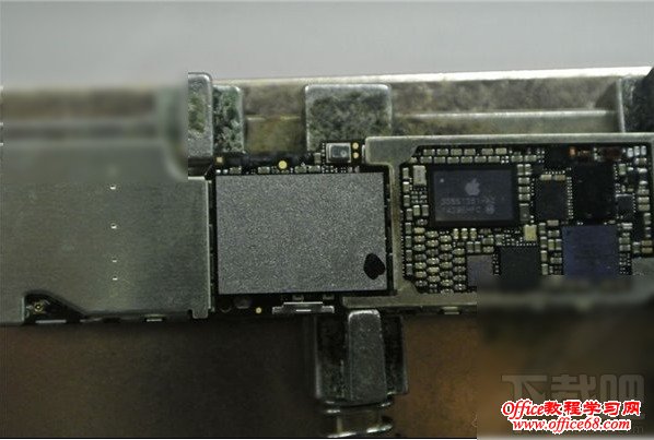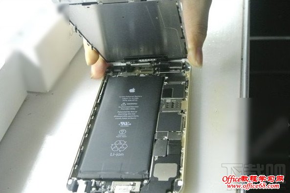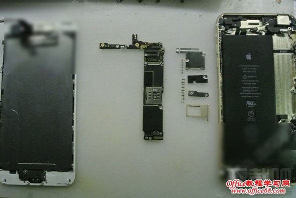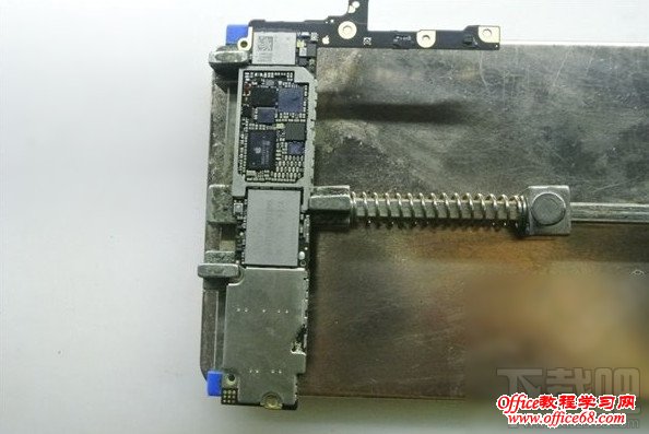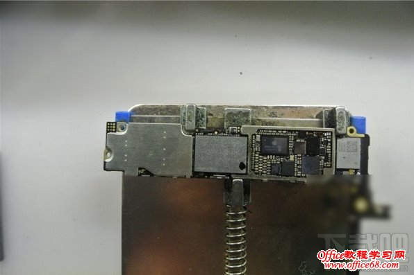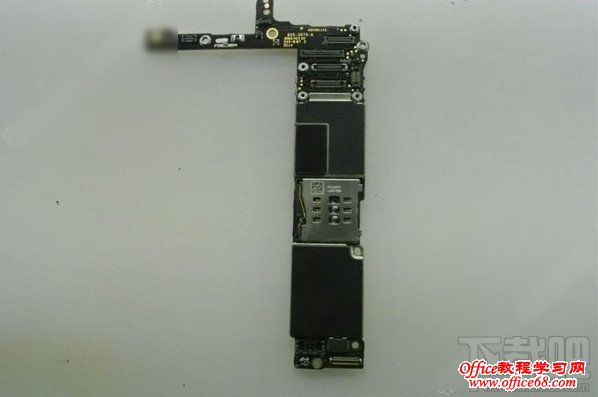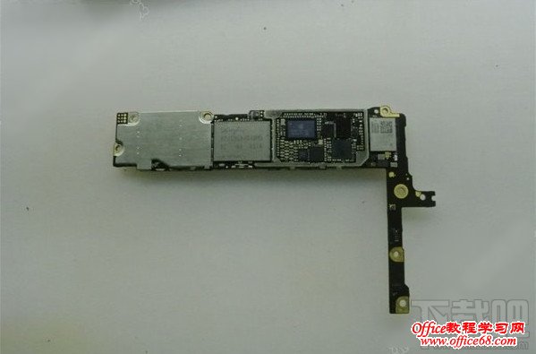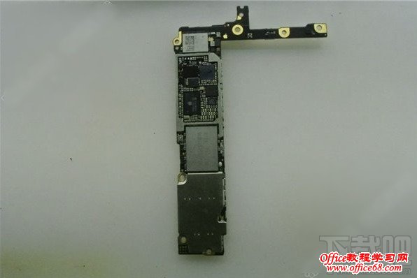 第四步:6plus主板相对比上一代5S的主板更薄了,像摔过挤压更容易损坏,不过为了把机身做薄就不得不牺牲PCB板的厚度,主板背面中间那一块白色芯片就是16G的闪存芯片了