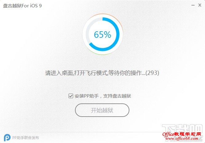 5. PP越狱工具正在为设备进行越狱,当进行至提示“请打开飞行模式”时,请打开苹果设备的飞行模式,PP越狱工具会继续越狱