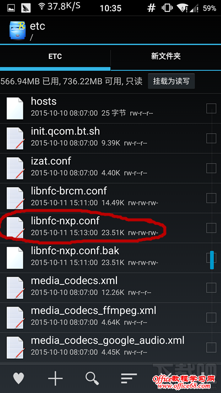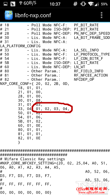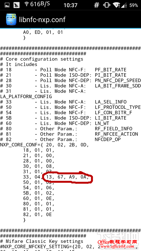 2、修改手机NFC的ID。打开R.E.管理器,根目录-->etc,找到etc文件夹中的“libnfc-nxp.conf”(注意备份好原文件!!!),以文本方式编辑,拖动到文件几乎尾部部分,找到类似图片的部分,可以看到默认的是01,02,03,04,原作者的一加手机的ID也是这个,我猜可能一加一代都是这个值。修改这个值变成卡的ID:13,67,A9,0A 。保存修改,重启手机, 去尝试通过门禁。(注意必须在唤醒屏幕的情况下nfc才有效,锁屏也不行。)