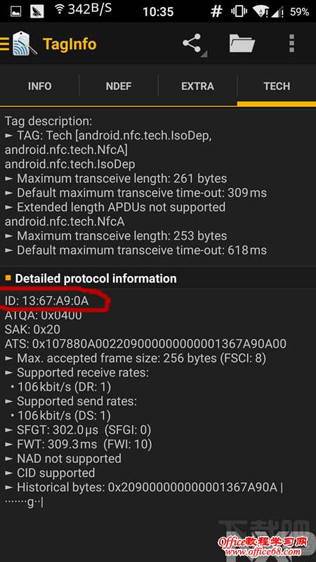 1、读取卡的ID。安装一个名叫“NFC TagInfo”的软件。打开手机的NFC设置,校园卡贴到手机后盖NFC部分,“NFC TagInfo”读取校园卡ID。可以看到我的卡ID是13:67:A9:0A