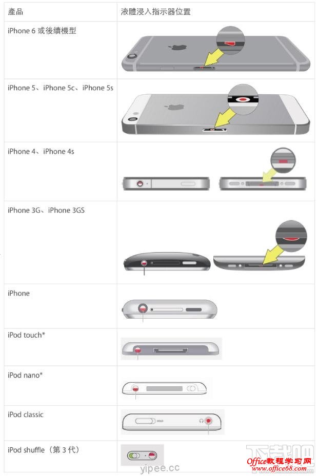 首先,准备一支放大镜和手电筒,拿起你的iPhone或iPod touch,依照下图选择你的产品型号,找到LCI位置仔细看看,正常的LCI颜色是白色或银色,但当它接触到水、过多蒸气时,就会变成红色。