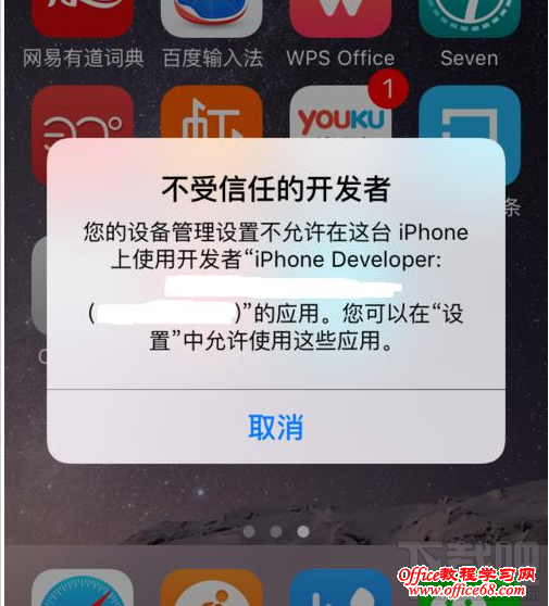打开安装好的应用,发现弹出“不受信任的开发者”对话框,而且更为只有取消选项。这是什么回事呢?那么在iphone上打开app时跳出不受信任的开发者怎么回事?能不能修改更为信任呢?下文就让小编跟大家讲讲iphone打开app跳出不受信任的开发者解决办法。 iphone打开app跳出不受信任的开发者解决办法:方法/步骤 1、打开安装好的应用,发现弹出“不受信任的开发者”对话框,而且更为奇葩的是只有取消选项。这让我如何是好?一头雾水啊。