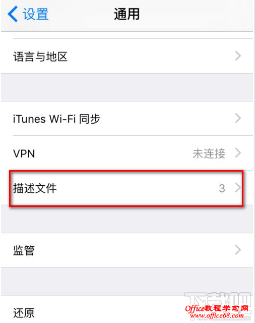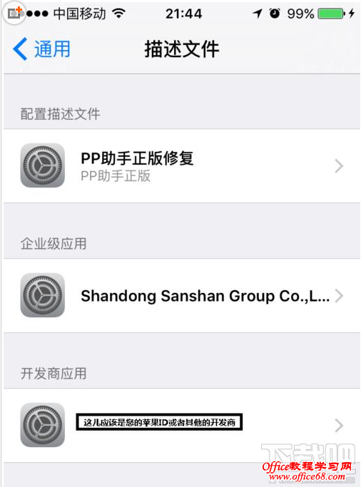 2、按他的提示,找到设置,然后依稀记得安装pp助手的时候,有个“描述文件”的设置项,好像是管这一块的事情
