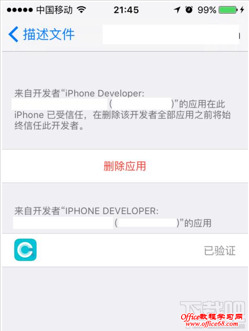 6、信任完以后,发现中间那一栏“信息(【我的苹果账号或者其他的开发商】)”,变成了“删除应用”,表示已经信任配置成功了。