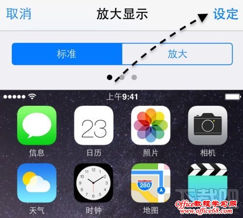 3:当前是采用的放大模式,即把原来的应用图标在桌面上等比放大。如果你想在主屏上获得更多的摆放空间,可以选择“标准模式”来显示,然后点击“设定”按钮