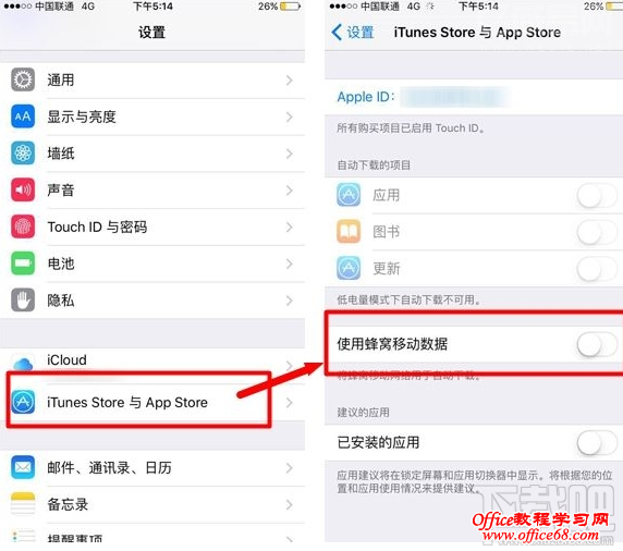 3、关闭App Store和iTunes Store的一些功能 在“App Store和iTunes Store”中关闭“使用蜂窝移动数据”和“已安装的应用”。应用建议将在锁定屏幕和应用切换器中显示。将根据您的位置和应用使用情况来提供建议。 关闭方法:设置->App Store和iTunes Store,关闭“使用蜂窝移动数据”