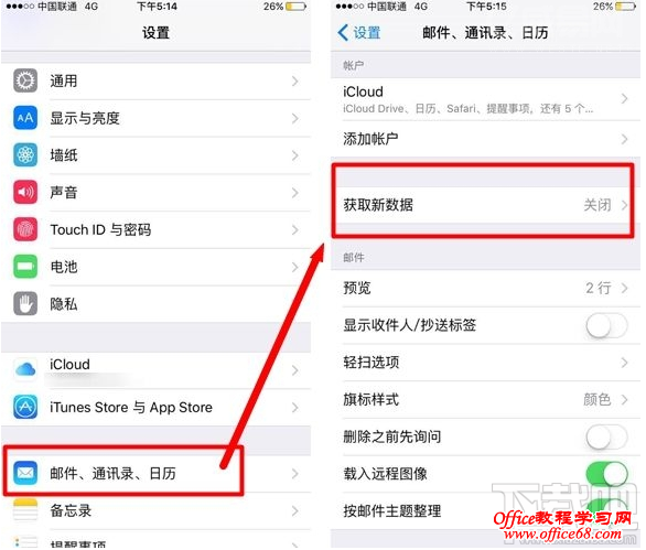 2、关闭“邮件”的推送功能 其实这个功能只要在“低电量模式”就会自动关闭,但是如果您平时也用不到收取邮件的功能,那么可以手动关闭它。 关闭方法:设置->邮件、通讯录、日历,在“获取新数据”中关闭“推送”