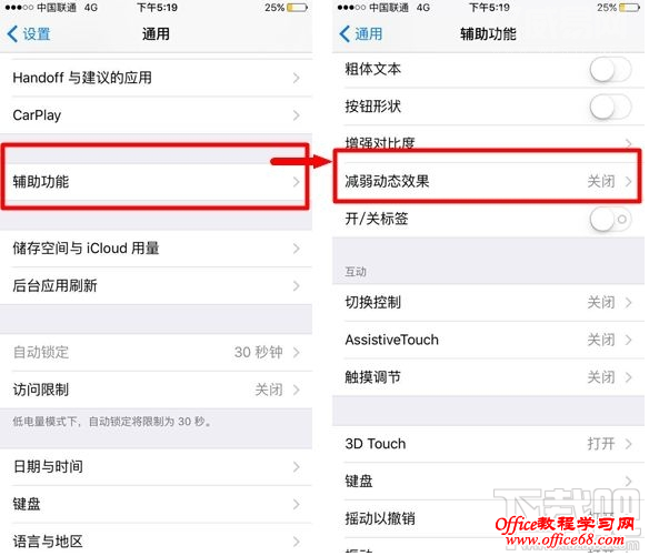 5、关闭“减弱动态效果” 这个功能在“低电量模式”也是会被关闭的,虽然影响一些视觉效果,但是对于省电来说还是很必要的。 关闭方法:通用->辅助功能,关闭“减弱动态效果”
