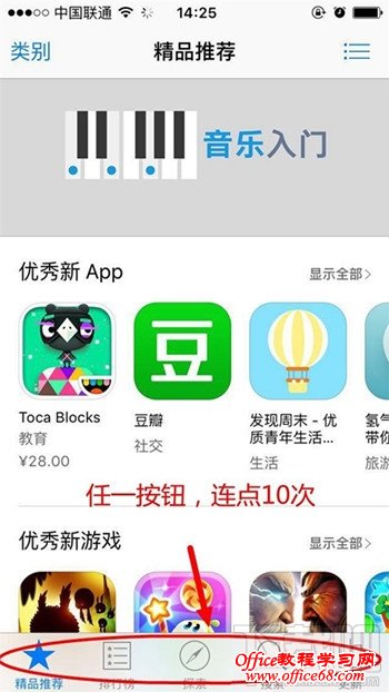 方法一: 1、首先让我们打开iOS的应用商店, 2、然后在下方菜单栏:精品推荐、排行榜、探索、搜索和更新在内的五个按钮,接着最关键的一步就是要快速连续点击10下其中的任意按钮,然后屏幕内容便会在短时间进入空白,你也就完成了重置应用商店缓存的工作了。