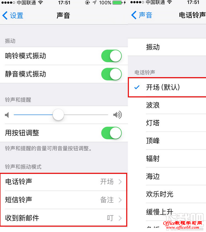 二、然后在iPhone6s声音设置界面中,便可以找到【铃声】设置了,我们可以对短信或电话铃声进行铃声设置,如下图所示: