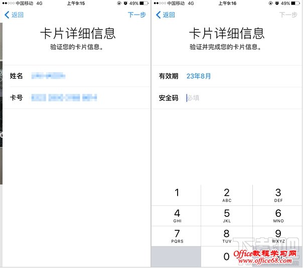 当Apple Pay读取完银行卡信息后,我们还要进一步完成信息验证,也就是填写银行卡的有效期和安全码。有效期安全码都可以在银行卡上面获取,有效期通常都印在银行卡的正面,而安全码则标示反面(用户签名处的后三位数字)。 步骤五:短信认证