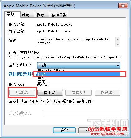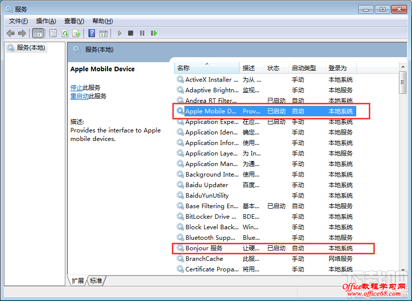 2、找到APPle mobile device 和Bonjour 这两个,点击右键看是否启动,点击启动。再点击右键--选择属性--启动类型为“自动” 然后重启电脑,在打开PP助手试试。