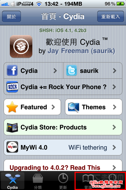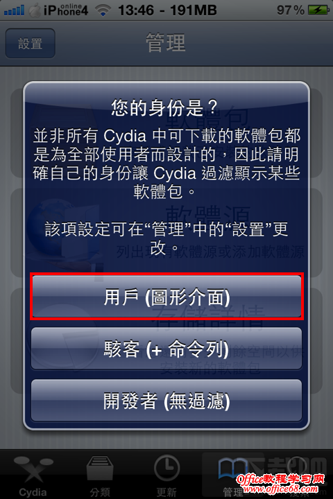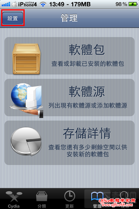 下方有几个选项,其中比较要关心的是『管理』跟『搜寻』 按一下管理会跳到这个画面,我们首先要做的是加软体源,Cydia 跟 App Store 不一样的地方是 App Store 把所有通过认证的 App 集中管理,而 Cydia 则是要去找软体的源头,把它加进去之后以后就可以搜寻到该网站的软体。 按一下『设置』,因为我们要先选择使用者权限。