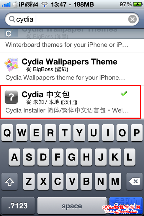加完之后请回到『搜寻』的地方,打上 cydia ,然后找 cydia 中文包,就可以先把 cydia 中文化