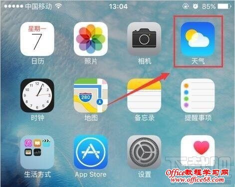 7、我们将手机切换到主屏幕中,在主界面上找到天气这项功能并打开
