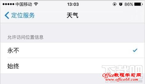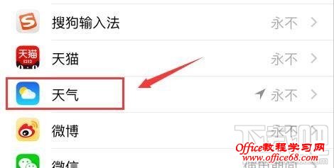 5、接下来在找到【天气】,在天气的右边会显示一个永不提示功能,然后打开【天气】