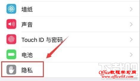 3、在设置功能里找到【隐私】,并且打开此功能进行设置