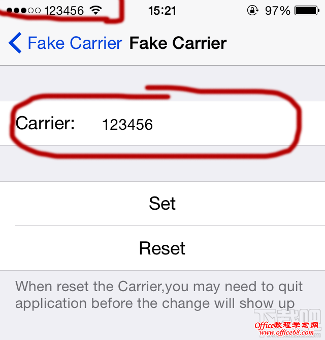 第二步,进去界面后有一个Carrier可以填写内容,填写完毕之后按Set后iphone的运营商就会更改了,非常的简单。