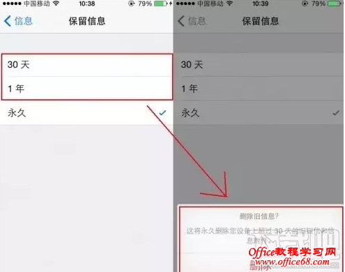 2.然后,你可以选择“1 年”或“30 天”,这就取决于你想要信息保留到何时。接着 iOS 将弹出的确认菜单,询问你是否需要删除这些过期的信息,要知道,该删除操作无法撤销哦!