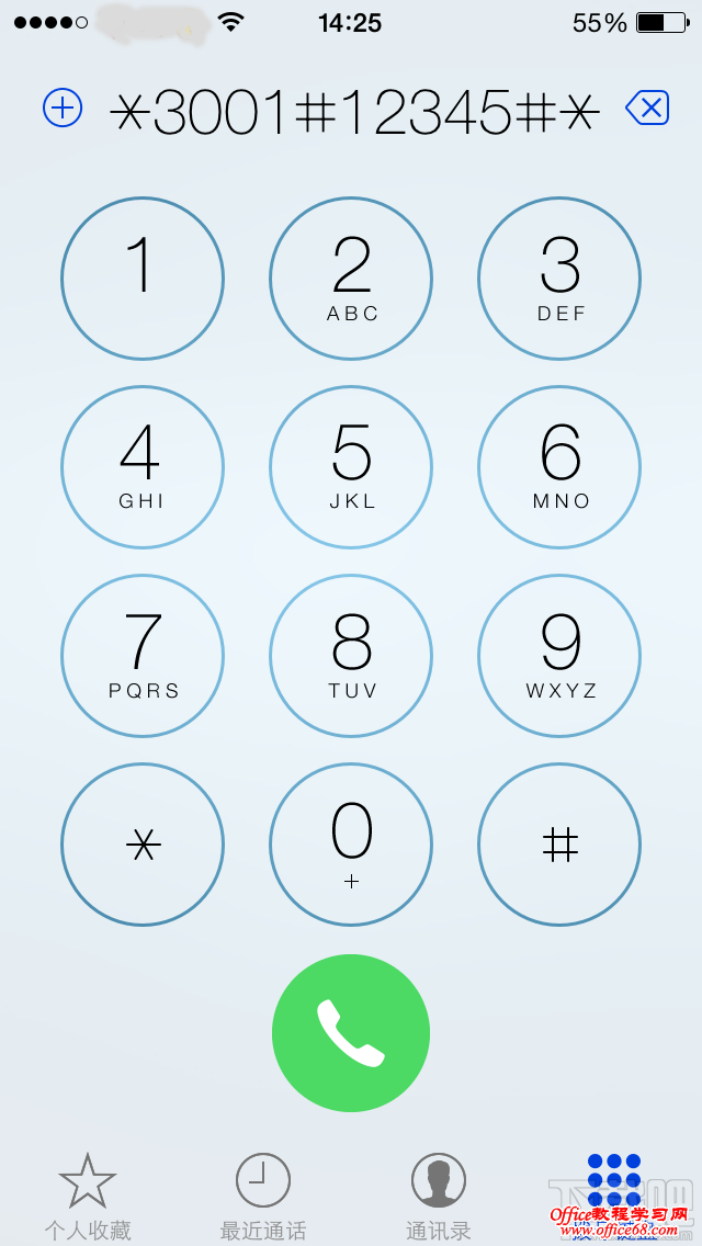从IOS7开始,iphone的信号图标就变成了小白点,如果你厌烦了小白点图标,那么可以把图标变成直观的数字显示,-40~-50表示在基站附近,-140就没有信号了,从-40到-140信号依次减弱。这个操作无需越狱,没有风险,只是打开了iphone内置的一个隐藏软件。 1、解锁iphone手机,进入界面中,此时信号显示是小白点。我们点击电话,进入拨号界面。