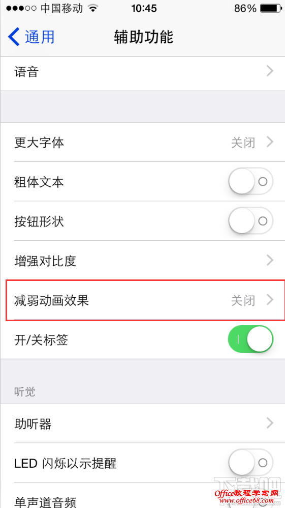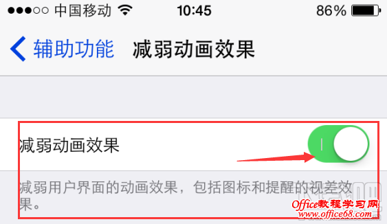第四步,进入到减弱动画效果界面,把减弱动画效果点开,就能很容易分辨出iphone的动态变化,完全不一样的效果,希望能帮助到大家!