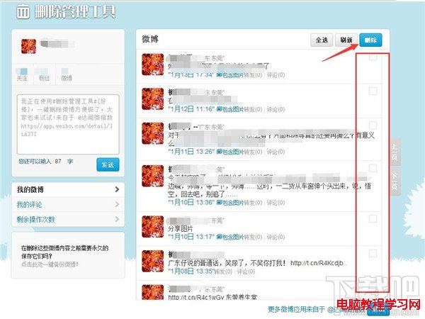 7、现在你就可以删除你的微博了,只要选择后面的正方块,然后点击删除就可以删除微博了;