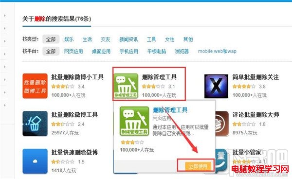 4、因为我们要删除微博,所以需要一个删除工具,我们在搜索栏里输入“删除”就行了;